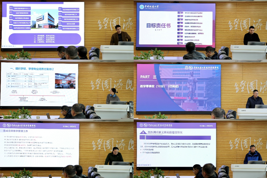 会上,统计学系、金融与贸易系、会计系、旅游管理系、经济学系、管理科学与工程系、工商管理系系主任分别从党建工作、教学、科研、人才引进、专业与学科建设等方面工作进展进行详细汇报,并分析了自身存在的问题和下一步工作思路。随后,学院综合事务办公室、研究生教育办公室、本科生教育办公室、德育工作组、专硕教育中心和实验教学中心科室负责人从2023年度目标工作责任完成情况、工作不足之处以及未来展望等方面作了工作汇报。