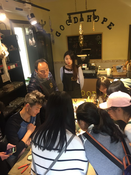 休整过后,师生一起前往位于武汉植物园附近的大李文创村,考察这一近几年才出现的文创艺术村的发育情况。在老师的带领下,学生们三俩结队观察并用相机记录村内外环境和设施,以游客身份参观文创作坊和民宿、试探文创产品价格、了解市场发育情况,以调查者身份访谈偶遇游客的动机和信息来源。粗略地一圈走下来,师生对该村作为城市文化创意空间的雏形案例形象及其价值就有了直观体认,一些同学还尝试用课堂中所学的理论和案例,分析和思考大李文创村的发展进路和对策,小专家的样子呼之欲出
