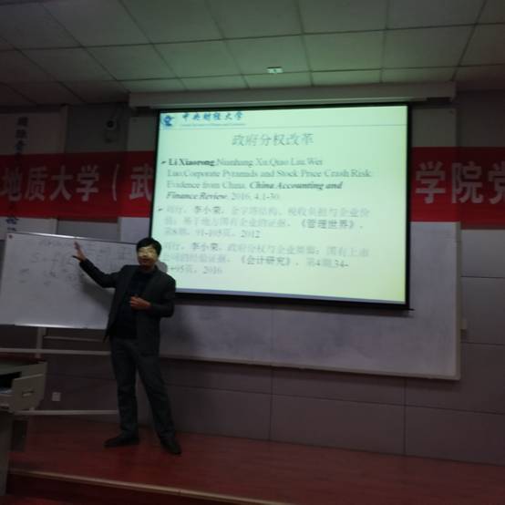李小荣教授以“政企关系视觉下的国有企业资产评估研究”为主题,分别从政府分权改革、国企高管权力、党委治理、在职消费以及政治不确定性五大方面深入剖析了国有企业资产评估中可能存在的问题以及相关对策;并通过案例分析,回顾了资产评估模型的发展,深入浅出地介绍了国有企业资产评估领域的多种研究方法;最后,李小荣教授就国企评估中可能存在的问题及相关对策做了总结性分析,引发在场师生的热烈讨论与交流。