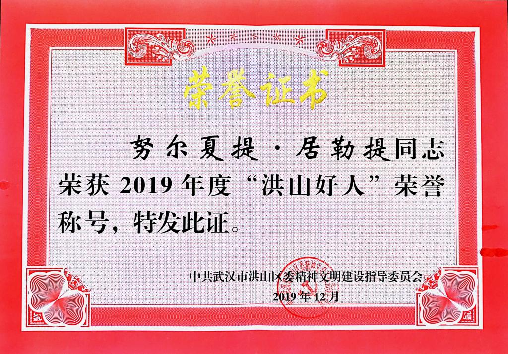 2019年度“洪山好人”评选结果近日揭晓,ky开元官网辅导员努尔夏提·居勒提入选敬业奉献好人评选,荣获“洪山好人”荣誉称号。据了解,2019年洪山区委宣传部、区委文明办等部门联合组织开启第六届寻找“洪山好人”活动,广泛发动辖区单位和群众推荐了220名人选,经过前期筛选和提炼,层层推荐和评委审定,45位(包含3个团队)身边的好人带着他们的感人事迹又一次进入大众视野。