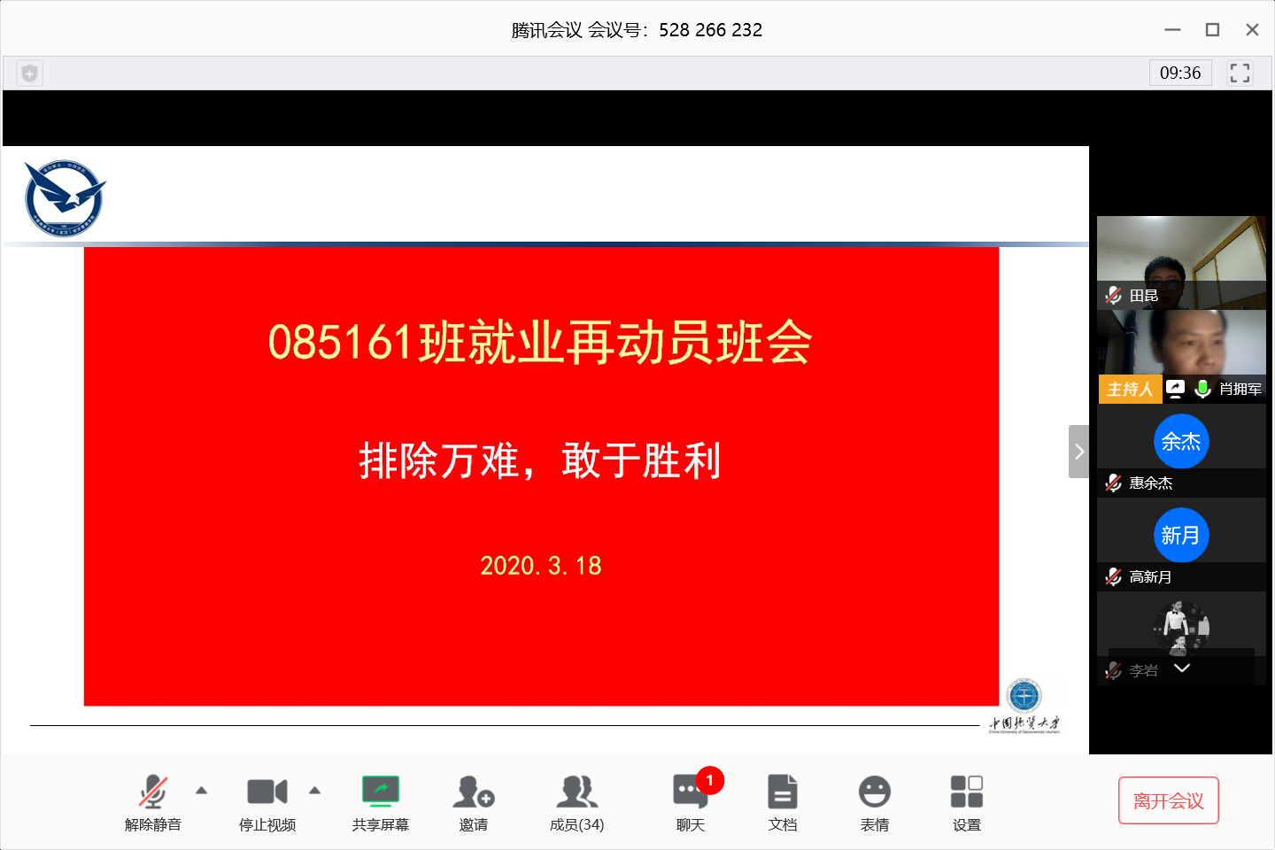 3月18日晚19:30,ky开元集团官网旅游管理专业085161班“排除万难,敢于胜利”就业再动员主题班会顺利举行。受到疫情影响,本次会议通过腾讯会议平台以线上形式开展,班主任、旅游系系主任肖拥军,学院16级辅导员田昆及旅游管理专业085161班全体毕业生共36人参加会议。