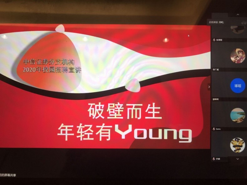在经验分享方面,校友兴业银行周奔经理结合自身经历为同学们剖析了考研与就业的机会成本,介绍疫情期间国家出台的大学生就业政策,鼓励同学们找准定位,认清自身情况,积极主动就业,他分享的观点获得与会师生的广泛认同。中信证券郑屹经理介绍了中信证券的主要业务及招聘政策,为同学们进行了一次在线招聘宣讲。钟丽华主管介绍了具体的薪酬待遇政策,鼓励大家抓住最后的校园招聘机会。