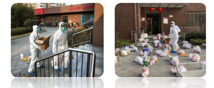 (左:刘耕老师正在分发居民订购物资 右:刘勇胜校长视察慰问)