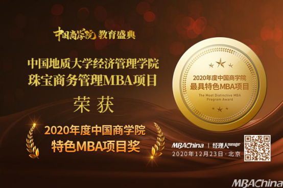 2020年12月23日,MBAChina与《经理人》杂志共同主办中国商学院教育盛典在北京顺利召开。中国地质大学珠宝商务管理MBA项目获“中国商学院特色MBA项目奖”。