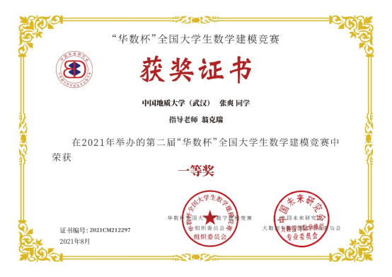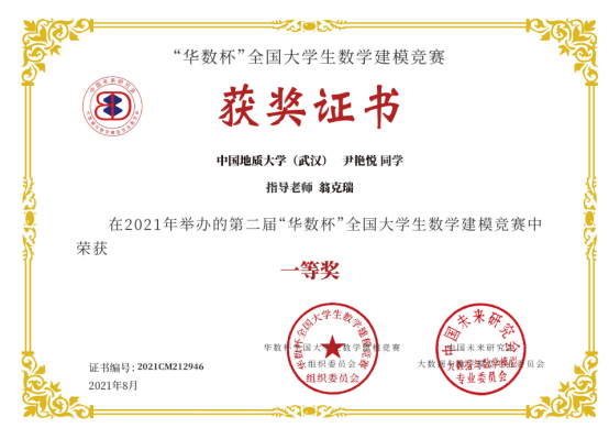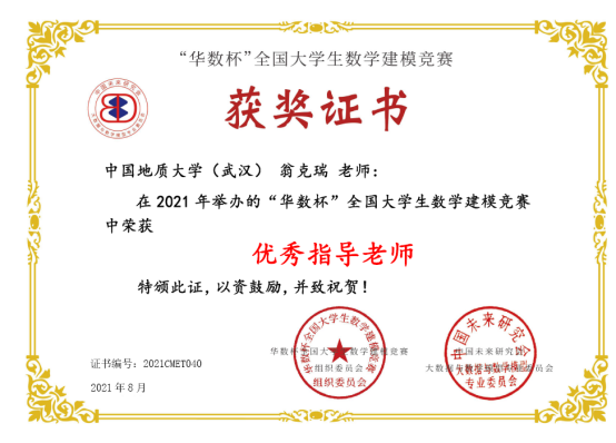 2021年第二届“华数杯”全国大学生数学建模竞赛于2021年8月5日-8日举行,本次竞赛共吸引2189支队伍参赛,竞赛专家组经过初评、网评、会评和复审四个阶段的评审,评选出一等奖184支,二等奖370支,三等奖550支。ky开元官网翁克瑞老师带队的2支队伍获一等奖,1支队伍获二等奖:李林森、 张爽、李佩的队伍获一等奖;刘林凯、尹艳悦、 程浩鋆的队伍获一等奖;潘信、郑咏杰、裴璇子的队伍获二等奖。此外,ky开元官网贲雅雯同学的队伍在数理学院付丽华老师带队下获三等奖。翁克瑞老师被评为 “优秀指导老师”。
