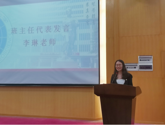 典礼第三项,新生班主任代表李琳老师发言。李老师对新生提出了三点希望。一是希望大家能够找到理想的目标和人生信念,对即将到来的大学生活做好规划;二是希望大家能够不负韶华,奋勇向前,有计划、有步骤地走好每一步;三是希望大家做一个有担当的人,勇担时代赋予我们的使命,不断用知识来充实自己。