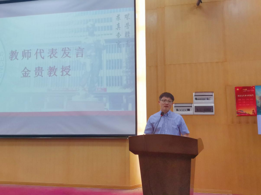 典礼第二项,教师代表金贵教授发言。金老师结合自身的求学经历,围绕“3个关键词,2个期望”,对大家的成长成才提出了殷切的期望。他告诉大家,要学会自主学习、独立思考、培养逻辑思维,充分利用多元化的学习方式,不断探索真知。同时,也要不负好时代,珍惜现有的学习机会,做一个实干家,在仰望星空的时候,也要记得脚踏实地。