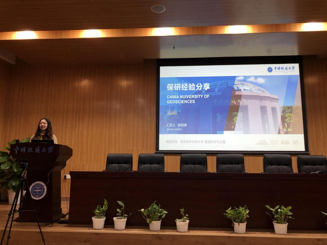 在分享环节,首先分享保研经验的是李佩同学和钱丽瑾同学。李佩同学一直以来都以保送研究生作为自己的学习目标,钱丽瑾同学则是本来以考研为目标最后意外保研。两名同学结合自身的经历,从保研择校、保研面试、保研春夏令营的参加等的注意事项为同学们分享了自己的经验和心得。