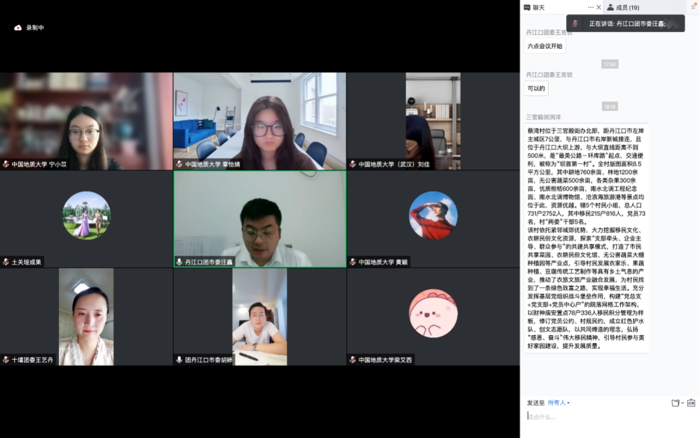 (通讯员 梁艾西努尔夏提·居勒提)为深入贯彻落实省委省政府关于广泛开展美好环境与幸福生活共同缔造活动相关部署要求,深度参与基层社会治理,根据团省委深化“社区(村)青春行动计划”总体安排及学校团委组织部署,8月22日晚,我校“青力缔造”青年实践队与十堰丹江口市召开了线上进驻对接会。十堰团市委副书记王艺丹、青年发展部部长刘荟,丹江口团市委书记胡婷、副书记汪鑫,土关垭镇团委书记成果,三官殿办事处团委书记闵润洋,我校团委副书记郭小玉,经管学院党委副书记李少杰、副院长郭锐、团委副书记努尔夏提·居勒提及ky开元集团官网“青力缔造”青年实践队全体成员参加。受疫情影响,会议通过腾讯会议平台召开。