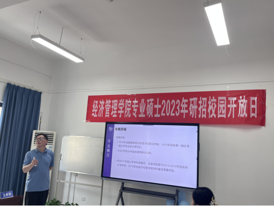 在专业介绍及优势特色宣传环节,经济系王来峰老师详细介绍了资产评估专业的发展历程与我校资产评估专业学位点的发展情况、师资队伍、科研竞赛、在校生与毕业生情况,他指出我校资产评估特色专业方向有:矿业权评估、珠宝价值评估、土地价值评估。
