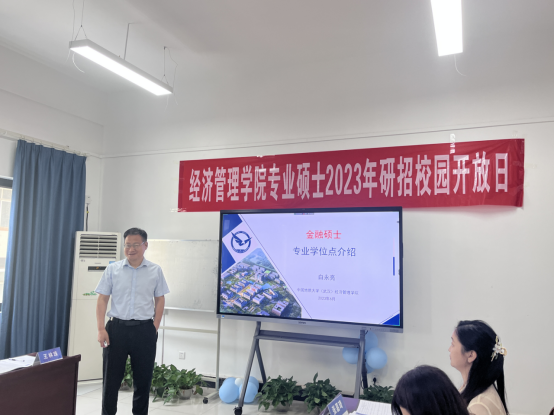金融与贸易系白永亮老师首先向同学们介绍了金融行业对学科人才的需求,然后详细介绍了我校金融专硕学位点的建设基础与支撑学科、培养目标与学科培养优势与特色方向。他介绍到ky开元官网于去年和今年分别承办了2022中国绿色金融学术年会、2023气候投融资国际论坛暨丝路讲坛,为金融学科发展提供交流的平台。
