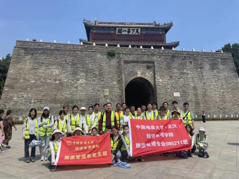 随后,老师们带领大家来到天下第一关景区。天下第一关景区拥有巍峨的“天下第一关”城楼及完整的关城防御体系,有“一夫当关,万夫莫开”、“两京锁钥无双地,万里长城第一关”的盛誉。同学们首先学习了天下第一关的古城防御体系、结构和军事功能,随后跟随老师逐一对城墙、罗城、瓮城、箭楼等各部分进行研究、剖析。设置于城中的兵部分司署也为我们了解古代衙署的布局提供了范例。长城上的箭楼、神威大将军火炮以及“瓮中捉鳖”的瓮城设计让同学们兴趣盎然,惊叹古人的智慧。在雄伟的天下第一关城楼下,我们集体留影,深刻领悟长城的民族象征,提升爱国主义情操。