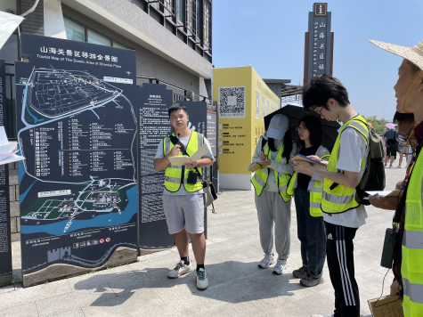长城文化薪火相传,孟姜女的故事妇孺皆知。孟姜女庙将民间传说固化为实体景区。当天的最后一站我们来到了孟姜女庙,体验民间传说类景区的设计、艺术展示及布局。通过老师们的讲授及同学们的模拟导游讲解,我们观察到了姜女庙传统的建筑风格;认识到了中国古典园林造园艺术妙处,对姜女苑实物展现的孟姜女故事进行了认真思考,积极讨论,传统民间爱情传说与新时代思想产生交流与碰撞,绽放出新的火花。