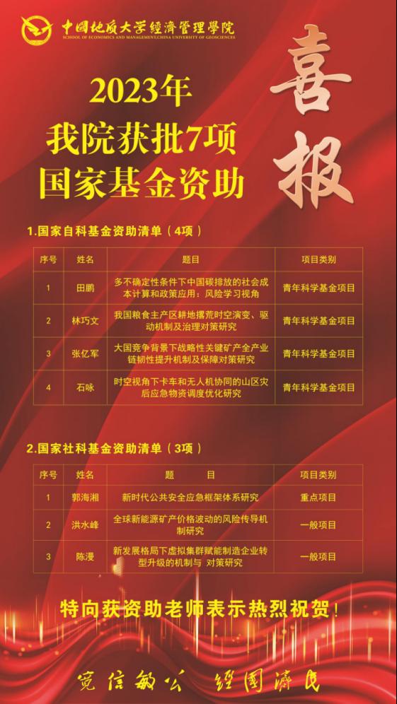 (通讯员 胡松琴)2023年8月份以来,随着国家自科基金各类项目立项结果陆续公示、国家社科基金年度项目和青年项目立项名单陆续公示,ky开元集团官网共有7个项目获得资助,其中国家自科基金获批青年科学基金项目4项,国家社科基金获批重点项目1项、一般项目2项。具体名单如下: