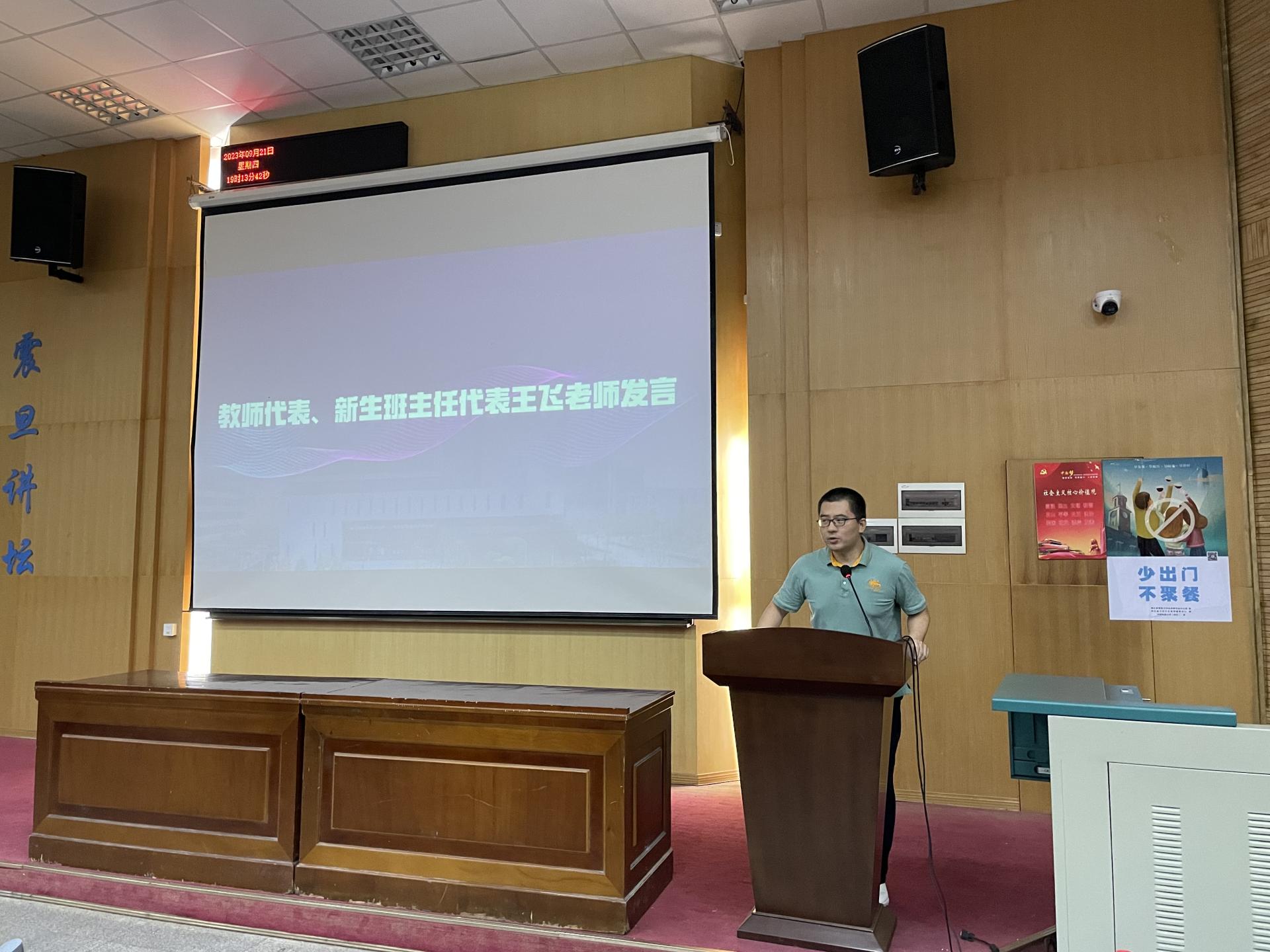 典礼第三项,教师代表、班主任代表王飞老师发言。王老师结合自身经历,对同学们的成长成才提出了殷切的期望。他希望大家成为一个眼中有光、心中有爱、行中有善、脚下有远方的新时代大学生,要坚定“努力拼搏才有收获,放松懈怠必然失败”的信念。同时,要积极开拓视野,并以坚韧不拔的毅力做好应对各种挫折困难的准备。
