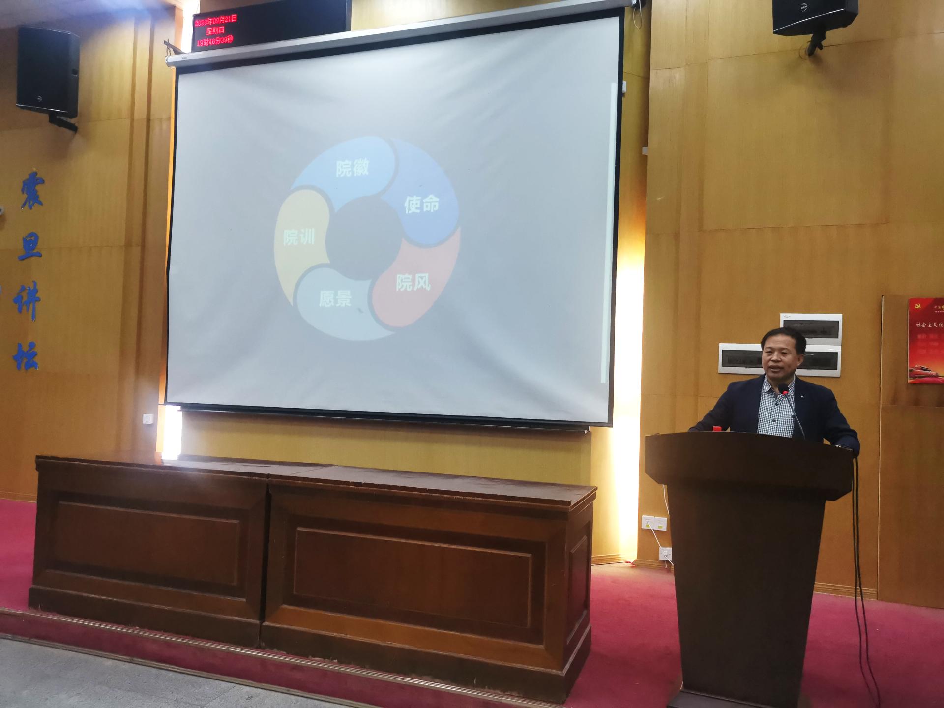 典礼第八项,院党委书记杨昌锐为全体新同学讲授开学第一课——《经管学院文化》。他从学院院训、院徽、院风、使命、愿景五个方面对学院文化进行深入解读,并与新生分享了“学习工作十观”。希望全体新生能够在良好的学院氛围下,努力拼搏进取,不断追求卓越,早日成为“品德高尚、基础厚实、专业精深、知行合一”的地大人。