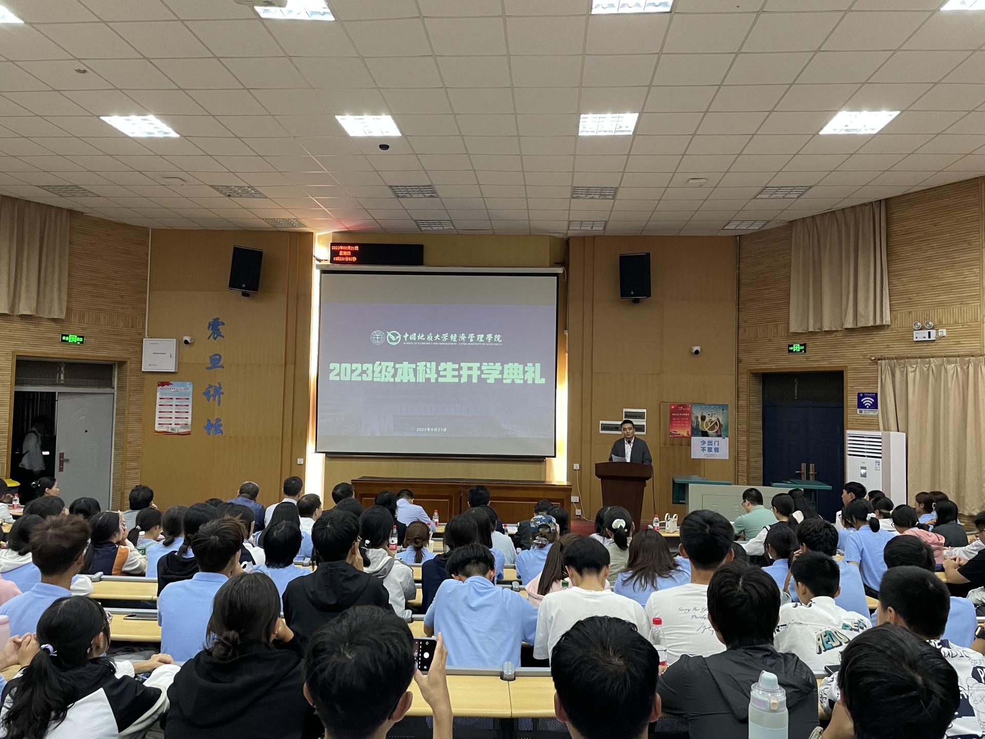 典礼第二项,院长於世为教授致辞。於院长首先对新生加入地大经管大家庭表示祝贺和欢迎,随后从学科建设、专业设置、人才培养等方面介绍了学院概况,并对新生提出了三点期望。一是期望大家热爱伟大祖国,勇担时代使命;二是勤于学习、善于思考、敏于实践,求得真知真理,练就过硬本领;三是拥有健全人格,锤炼品德修为。