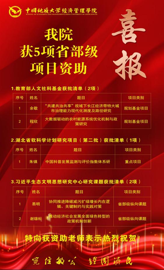 (通讯员 胡松琴)近日,随着2023年度教育部人文社会科学研究一般项目评审结果的公示、2023年湖北省软科学计划研究项目(第二批)拟立项项目向社会公示、习近平生态文明思想研究中心2023年度研究课题的公示推出,ky开元集团官网获批省部级项目共5项。其中教育部人文社科2项,省软科学计划研究项目(第二批)重点项目1项,习近平生态文明思想研究中心研究课题2项。具体名单如下: