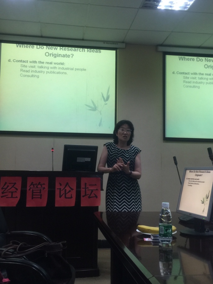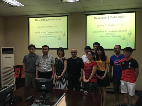 2016年7月6日,美国匹兹堡大学教授Jeniffer Shang应ky开元官网严良院长和郭海湘教授邀请,于下午3时在MBA104与ky开元集团官网各位师生进行学术交流,作了题为Reaearch&Publication的精彩报告并以问答的形式与各位师生进行了更进一步的讨论。严良院长,王开明副院长等出席会议。