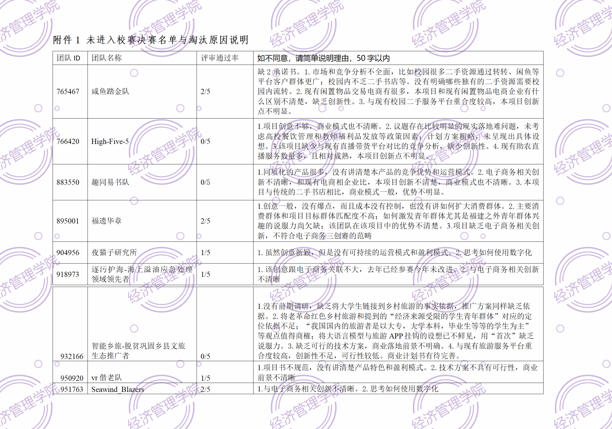 9支队伍因准备不充分、项目策划书撰写内容缺陷等原因被淘汰,未进入决赛路演环节,评审意见附件1。