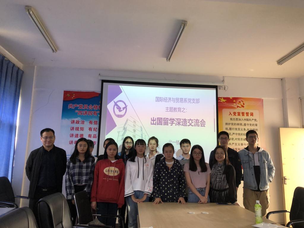 (通讯员:易杏花 苗瑞瑞)2019年10月24日14:00—16:30,ky开元集团官网国际经济与贸易系党支部在北一楼421室召开了出国留学深造交流会,这既是党支部“结对领航”的一项重要工作内容,也是“不忘初心 牢记使命”主题教育的一个重要环节。活动由国际经济与贸易系党支部书记易杏花主持,系主任白永亮、系副主任洪水峰,国贸系2016级本科生田翔、安浩楠、邓学霖,以及17级——19级有志于出国留学深造的学生参加了本次活动。