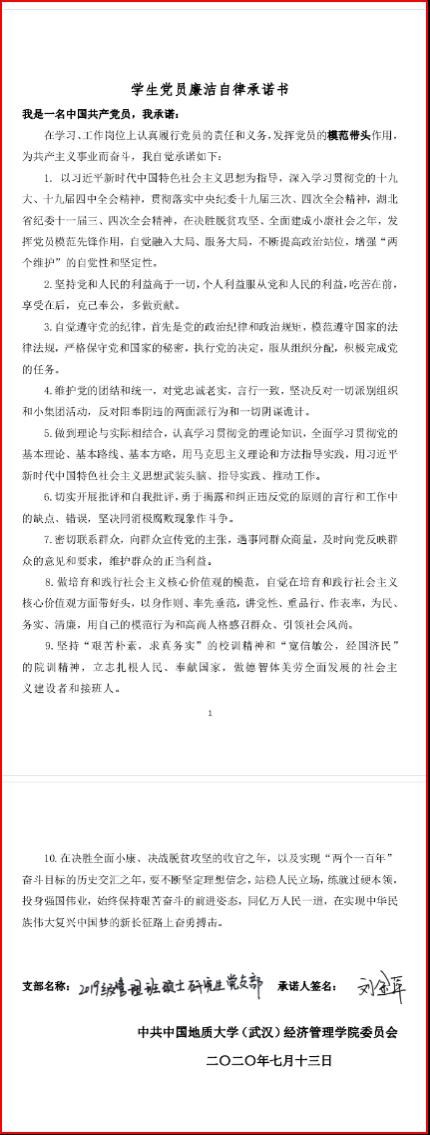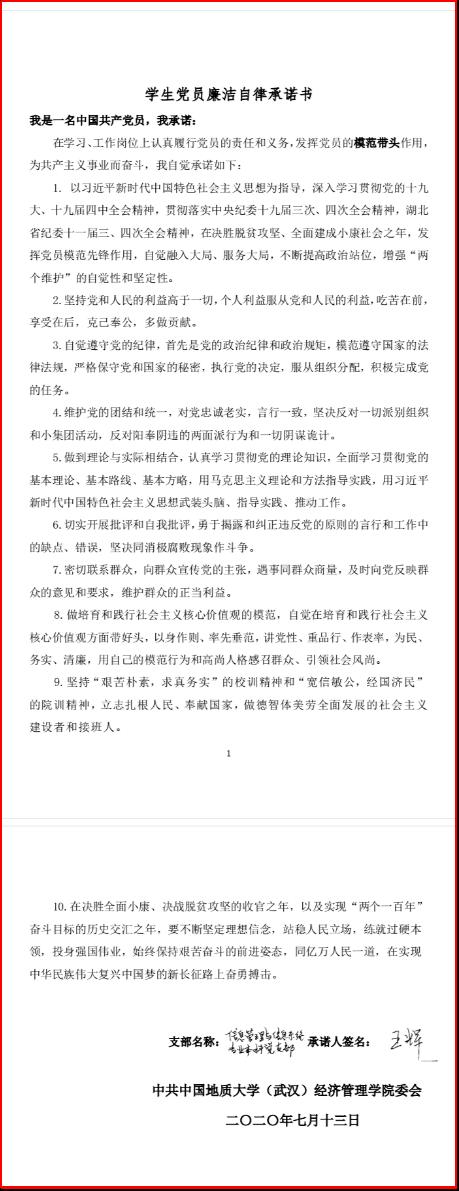 推进支部建设,切实肩负党风廉政建设责任。学院党委积极贯彻落实学校《党风廉政建设责任制实施办法》,组织全体学生党员签订《学生党员廉洁自律承诺书》,要求学生党员在学习、工作岗位上认真履行党员的责任和义务,自觉遵守党的纪律,在决胜脱贫攻坚、全面建成小康社会之年,不断提高政治站位,增强“两个维护”的自觉性和坚定性,主动将支部党风廉政建设融入上级党组织“一级抓一级,层层抓落实”的党风廉政教育体系当中。