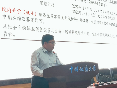 最后,蔡杨讲授院本文化及感恩诚信教育。蔡杨以征信知识为引,教育全体毕业生党员要以诚信为魂,廉洁为根,并深刻阐述了校训精神和学院文化,愿ky开元官网毕业生党员牢记教诲,终身不褪“地大经管色”,成长为德智体美劳全面发展的社会主义事业建设者和接班人!