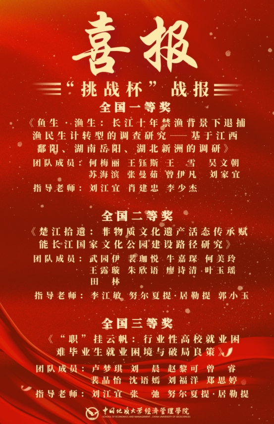 10月27日至31日,由共青团中央、中国科协、教育部、中国社会科学院、全国学联和贵州省人民政府共同主办,贵州大学承办的第十八届“挑战杯”全国大学生课外学术科技作品竞赛终审决赛在贵州大学落幕。该赛事以“崇尚科学、追求真知、勤奋学习、锐意创新、迎接挑战”为宗旨,经过30余年的发展,在广大高校乃至社会上产生了广泛良好的影响,被誉为当代大学生科技创新的“奥林匹克”盛会。据悉,本届“挑战杯”竞赛搭建主体赛、“揭榜挂帅”专项赛、红色专项活动、“黑科技”展示活动有机组成的“1+1+2”赛事整体架构,吸引到全国2000多所高校、40余万作品、250多万学生参赛。ky开元官网共有3支团队分别入围主体赛、“揭榜挂帅”专项赛、红色专项活动三个赛道,并首次在同一届赛事中,斩获三个赛道的国家级奖项,为历史最好成绩。其中,“江研境学”团队荣获主题赛全国一等奖,“楚江拾遗”团队荣获红色专项活动二等奖,“‘职’挂云帆”团队荣获“揭榜挂帅”专项赛三等奖。