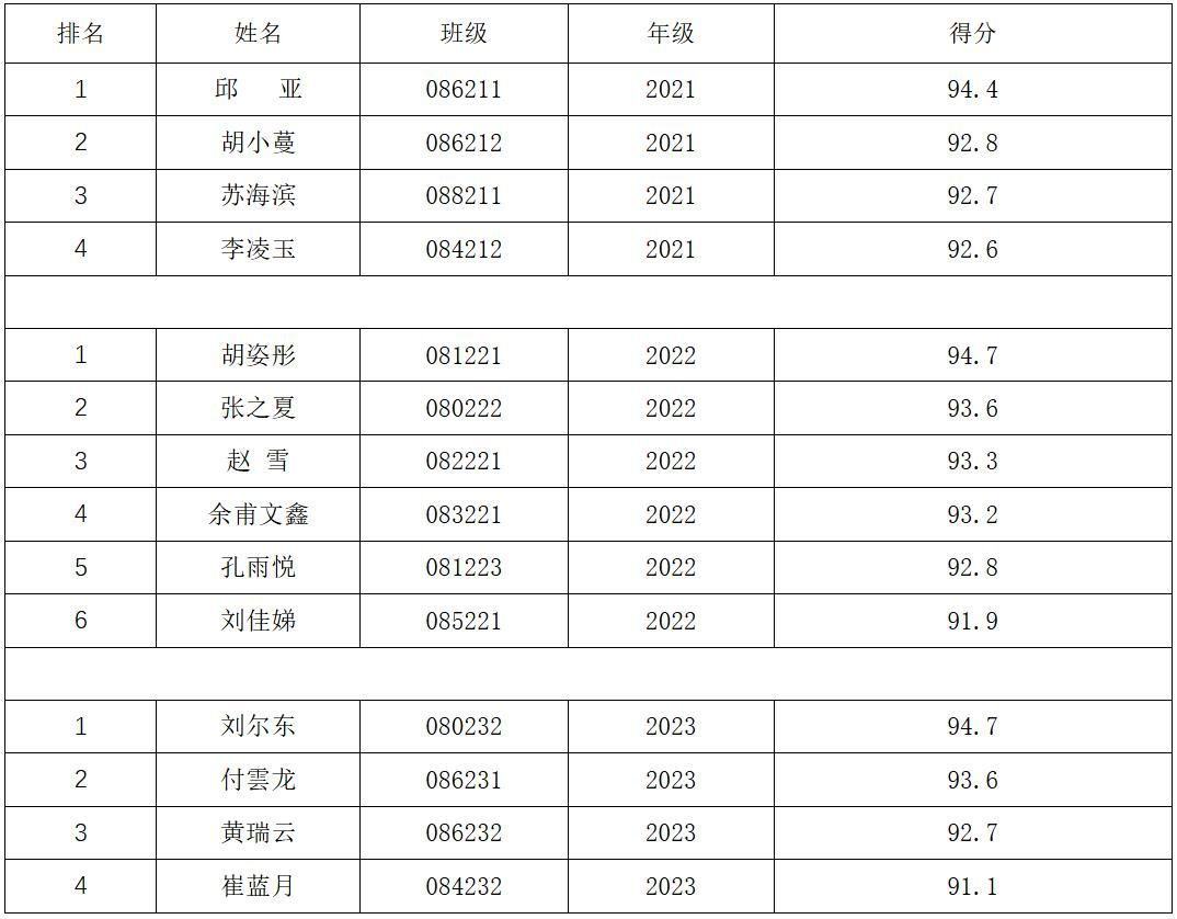 2024年9月25日,学院组织开展2024年本科生国家奖学金答辩,经12位评委老师独立打分,现将学院拟推荐人选答辩成绩按年级公布如下: