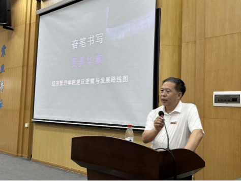最后,学院党委书记杨昌锐以“奋笔书写更美华章”为题,围绕院徽、院训、愿景、院风和使命,阐述了学院“鹰文化”所代表的领先精神,以及“宽信敏公 经国济民”院训中视野、诚信、敏行和担当的内涵。他勉励新生深刻理解学院“经国济民”的使命与建设高水平研究型学院的愿景,传承和谐奋进的院风,努力成为兼具家国情怀和专业能力的卓越人才。