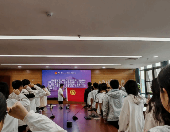 主持人邓婷芮宣读新发展团员名单。院团委书记徐媛、副书记张弛、党员代表屈沁雅共同为全体新团员佩戴团徽、颁发团员证。新团员们面向团旗,庄严宣誓。