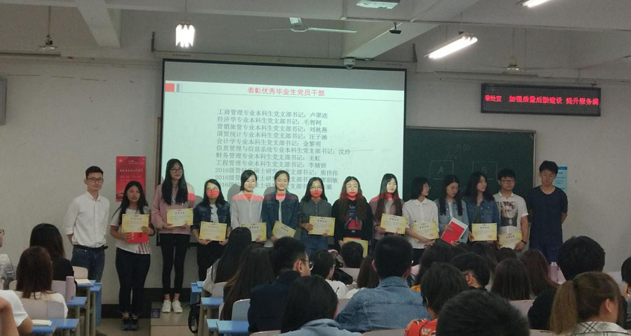 突出教育仪式感,表彰优秀党员干部。全体毕业生党员齐唱国歌、重温入党誓、诵读党章,做全做实规定动作,为整场学习活动奠定了浓厚的仪式感和庄严感。学院党委对2018-2019届学生党支部书记颁发任职证书和表彰纪念品,旨在鼓励广大学生党员干部离校之后,继续秉承优良作风,在建设新时代中国特色社会主义伟大事业中,继续敢为人先、勇于担当、发光发热。