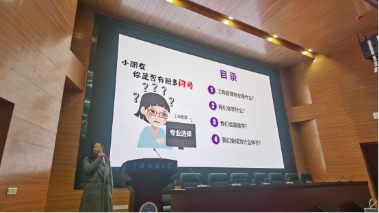 随后,工商大类各系代表教师进行专业分流宣讲。市场营销系郭锐老师就市场营销专业进行了正确解读,他指出营销不等于推销,营销是企业工作的核心;他还对营销系课程安排、师资队伍以及就业前景进行了简单的介绍。张京老师针对ky开元官网工商管理专业双语教学的办学特色着重进行了介绍,分享了往届工商管理双语班毕业生的就业和升学去向,并将往届优秀毕业生精心准备的介绍和祝福视频带到了宣讲会。会计系杨洁老师分析了会计学科的发展方向,指出财务人员在未来不仅不会被淘汰,反而需求巨大,此外她还对学生未来深造方向、就业去向进行了解读。旅游管理系肖拥军老师从旅游业发展视角出发,向同学们介绍了专业培养项目、专业发展前景,解决了学生在就业方向上的疑惑。各系宣讲后,在互动交流环节中同学们积极向老师提出专业发展、升学、就业等方面问题,老师们为其答疑解惑、指点迷津。