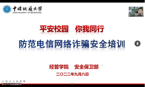 9月8日上午,学院工商管理系宋莉萍老师为全体同学讲授“沟通与礼仪”,虽然是线上教学,但线上互动仍然十分热烈,同学们在欢声笑语中掌握沟通与礼仪的核心技能。随后,心理健康中心刘陈陵老师进行大学生心理健康教育,提醒大家关注自身的心理健康,努力做一个积极向上的CUGer。最后,保卫处副处长彭冠军老师进行大学生安全教育,告诫同学们要谨防网络诈骗,提高警惕性!