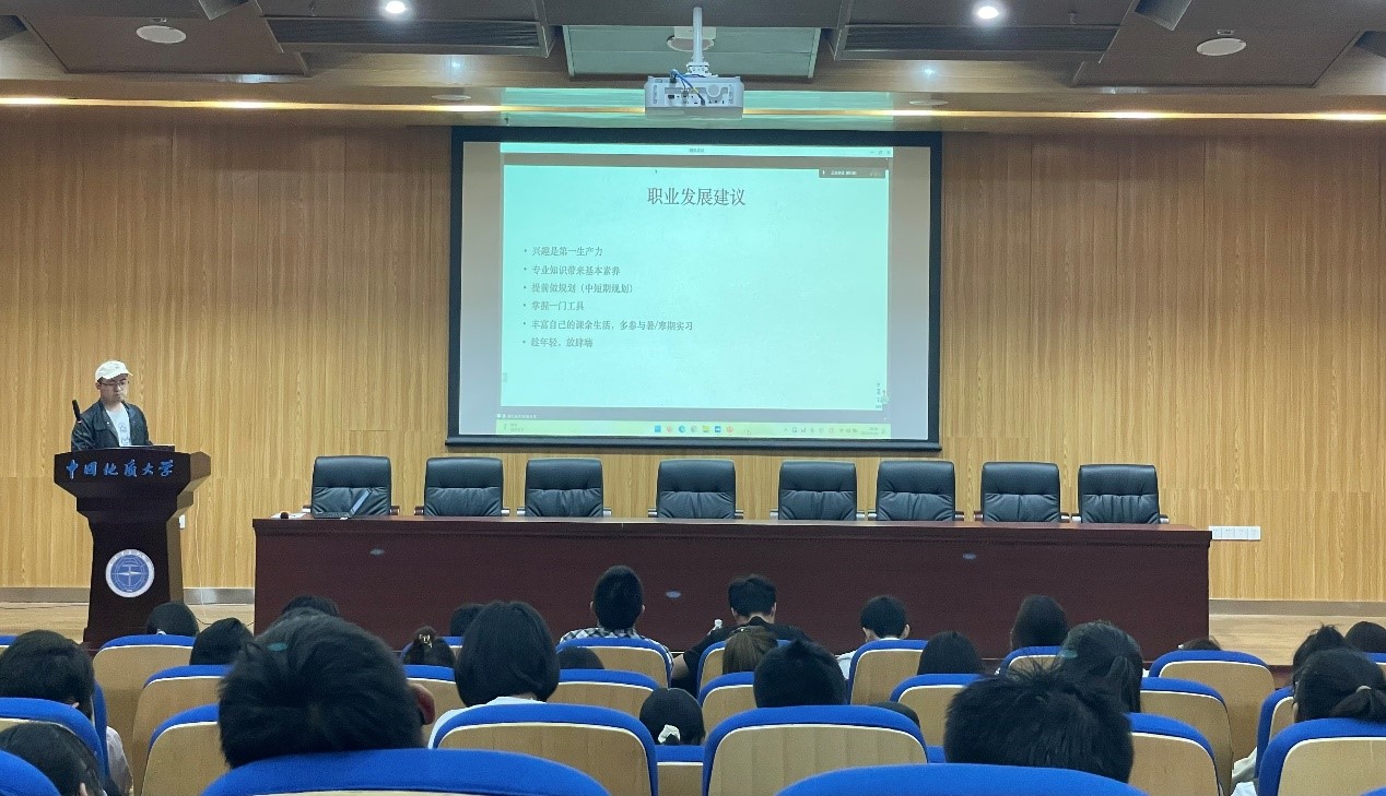 第一位向同学们分享的校友是现就职于北京的夏乐学长,他是2007级信管专业的毕业生,是本专业较为早期毕业生的一员。首先,他向同学们提供了同届毕业生的毕业去向:国外大都是美国、新西兰地区;国内则聚集在北京、深圳和武汉区域。然后,夏学长简单分析了本专业的未来形势,对2030年持乐观估计,认为我们未来可期。最后,他为同学们总结了一些学习生活规划建议,鼓励我们大胆试错,多参加竞赛与实习,在毕业后也不能浮躁,为自己规划十年的深潜期。