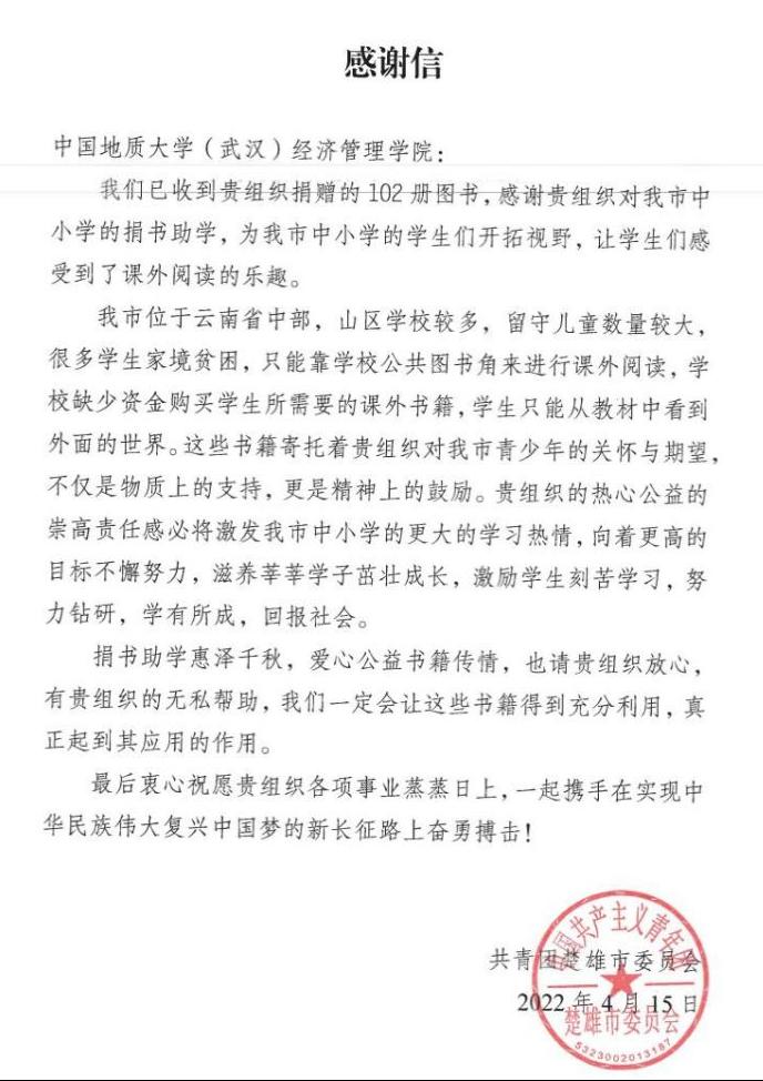 在一年的支教生活中,张康同学始终不忘自己是一名地大经管人,生活中发扬“艰苦朴素,求真务实”的校训精神,牢记“宽信敏公,经国济民”的院训精神,做到把地大精神带到服务地,讲好地大故事。积极配合研支团完成把地大特色活动开展到龙江的任务;利用班会时间给学生们播放地大相关宣传视频,讲述个人求学的故事,播撒希望种子。在五四青年节前夕,他带着支教团同学联系母校,发起向云南省楚雄市山村中小学校捐赠书籍的公益活动。本次捐赠活动得到了母校多个学院的大力支持,共筹集到书籍600余册,其中ky开元集团官网捐赠图书102册,涵盖文学、科普、经济、教育等多个领域。共青团楚雄市委员会对支教团及地大学生捐赠之举表示衷心的感谢,并向ky开元官网发来感谢信。