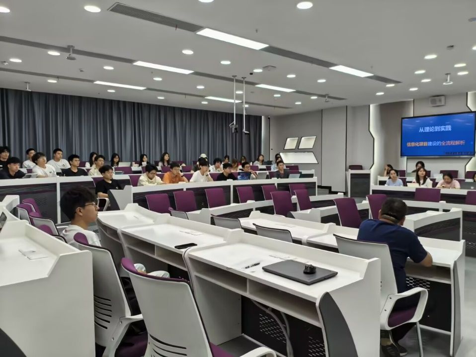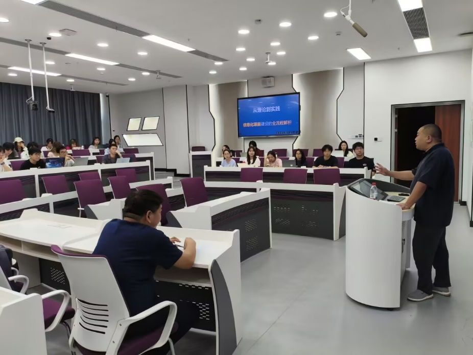 首先,王广民老师邀请了来自广州金鹏集团有限公司的王经理,给在场大三信管学生进行了《信息化项目建设的全流程解析》的专项报告,以政府部门信息化为例,分享了围绕政府部门信息化项目,从规划、实施到验收等阶段,详细阐述全流程中的要点、案例及对学生的启发。针对信管专业学生实习和就业痛点,重点拆解了信息化项目管理的流程,结合大量的真实案例和切身体验,为信管专业接下来的实习和求职工作提供了宝贵的实践素材和经验价值。