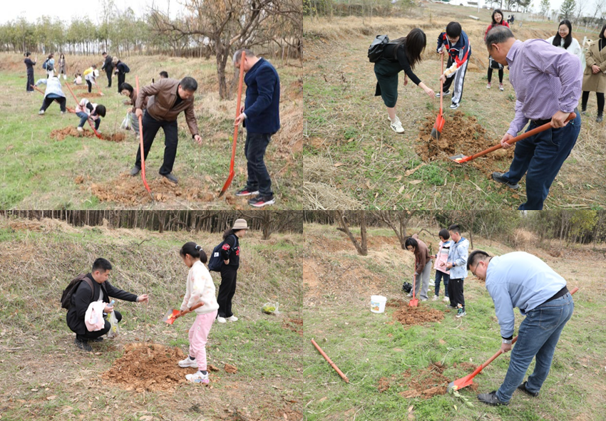 随后,大家来到高岗上,一同栽树育林。怀着绿化大自然、保护乡野田园自然环境的愿望,教职工们或与同事合作,或与家人携手,深挖坑、细栽苗、轻覆土、饱浇水,种下一颗颗充满希望的树苗。