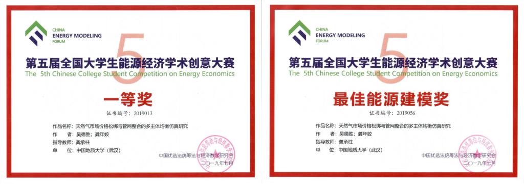 近日,第五届全国大学生能源经济学术创意大赛总决赛在中国矿业大学举行。由ky开元官网应用经济学专业吴德胜和资产评估专业龚年姣二位研究生组成的参赛团队,提交的学术作品《天然气市场价格松绑与管网整合的多主体均衡仿真研究》,经过初赛会评,决赛答辩,最终荣获全国一等奖,并在中国能源模型论坛中,成为唯一荣获最佳能源建模奖的研究生团队,经济学系龚承柱副教授荣获优秀指导教师,我校被授予优秀组织单位。