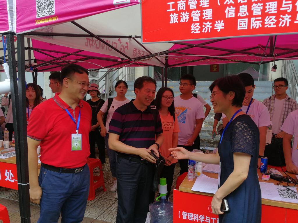 迎新过程中,校党委书记黄晓玫、学工处处长邬海峰等一行来到学院迎新点视察指导工作,黄晓玫书记与学院领导及奋战在迎新一线的辅导员一一握手,了解报到情况,赞许了工作人员和新生们的精神面貌,对学院迎新工作给予高度评价。