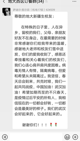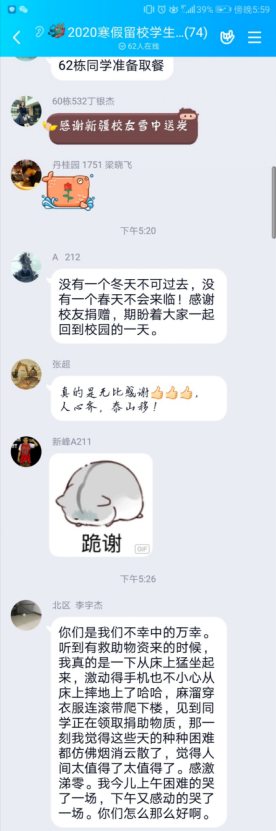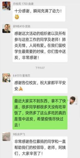 学校党委副书记王林清教授称赞道:“特殊时期,特别关爱,彰显同学情、爱校情,感谢同学们!”同时表达了问候。地大有真情,地大有温暖!在这个病毒肆虐的日子里,是地大“石榴籽”们用真情和爱心汇聚起了一缕阳光,团结一致为留在学校的同学们送去了温暖。收到援助物资后,老师和同学们用QQ、短信等方式纷纷点赞和表示感谢,也有的老师和同学以赋诗吟诵等方式表示致敬。